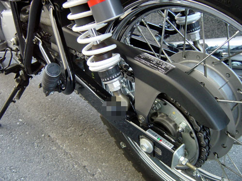 取り付けは前回のヤマリンズのときに経験していたので簡単にできました。 ただし今回は、ジャッキをエキパイに直接当てて後輪を浮かせちゃいましたが、 これはバイクショップでチェーン注油をやってもらった時の作業を真似たものです。 エキパイがフレームと固定されているところあたり(エキパイの黒い部分)に ジャッキを当てるような格好になります。 このとき、フロントブレーキを効かせるのがコツみたいです。 ブレーキレバーとグリップをゴムひものようなもので固定して、ブレーキを効かせます。 これで、ちょっとしたことでは動かない(ジャッキがずれない、倒れない)というわけ。 見た目はご覧の通り非常にすっきりとしています。 チェーンとスプリングの干渉も全く問題なし。 セッティングはしばらくは何もいじらないことにします。 そもそも腕を磨かなければ。。。